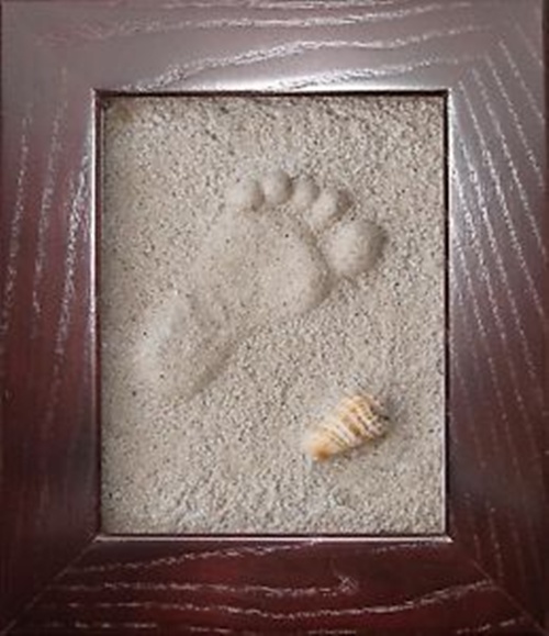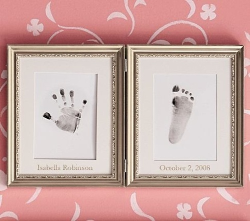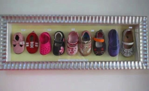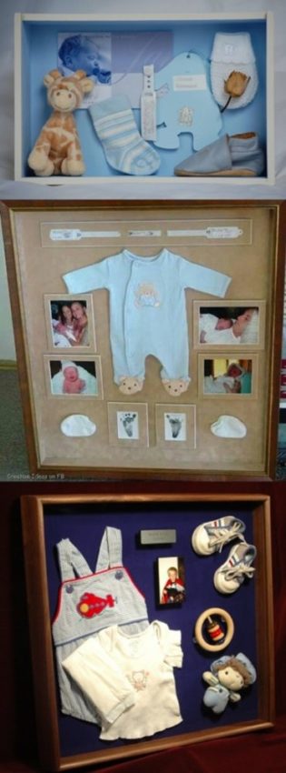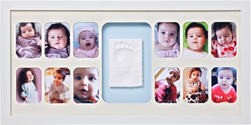 Vários objetos do bebê: você pode enquadrar a pulserinha da maternidade, o brinquedinho favorito, a meia pequenininha… Que fofura!