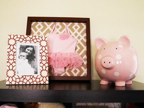 Roupinha: coloque uma roupinha no quadro. E perto dele, deixe um porta-retrato com a foto do bebê vestido com ela!