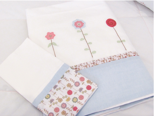 Conjunto de lençóis: com detalhes em azul, para as mães que, como eu, gostam da cor! Da Eliana Sposito.