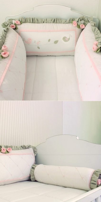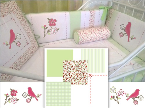 Kits de berço: com flores e passarinhos, da Lilibee e da Primeiro Quarto.