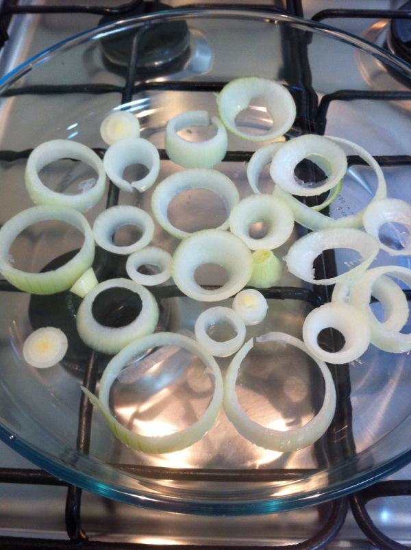 – Corte uma cebola média em rodelas e forre o fundo de um marinex.