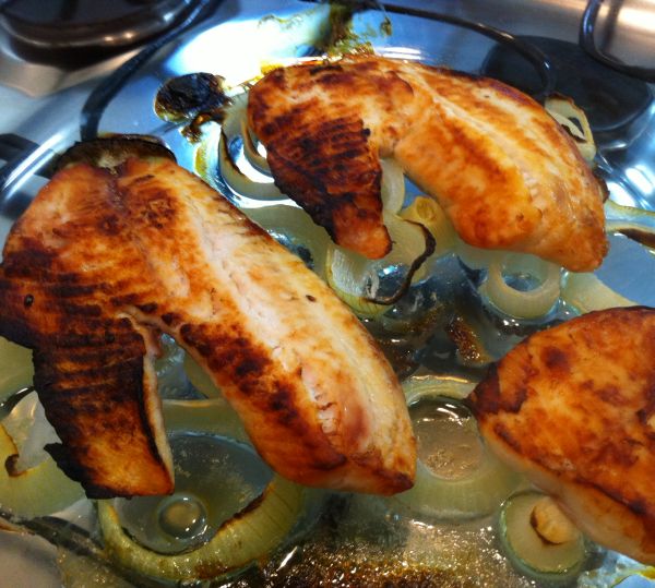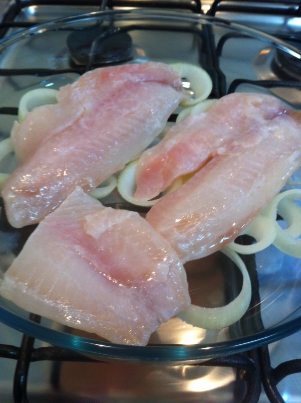 Logo que eu casei, costumava preparar o peixe na forma frita, até que descobri que era bem mais fácil prepará-lo no forno. Nada de óleo espirrando pela cozinha, sem necessidade de empanar… Basta forrar um marinex com rodelas de cebola e colocar o peixe (previamente temperado apenas com limão e sal) por cima e regar com azeite. Uma variação interessante é jogar tomatinhos-cereja junto com o peixe, ou mesmo usar tomates cortados em rodelas. Depois que passarem pelo forno, a cebola fica bem molinha (e levemente adocicada) e o tomate sequinho. Catarina adora!