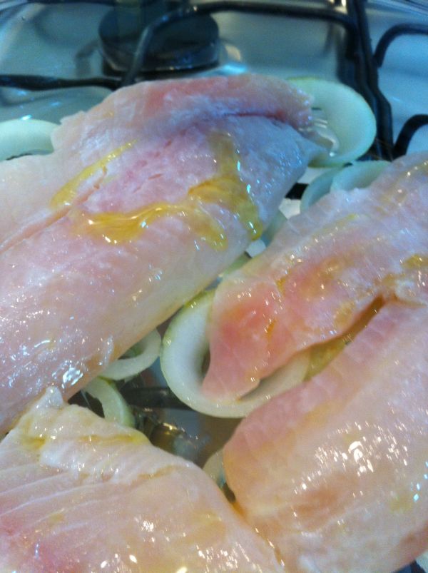 – Disponha os filés de peixe sobre as rodelas de cebola. Se quiser, coloque também rodelas de tomate ou tomatinhos-cereja.