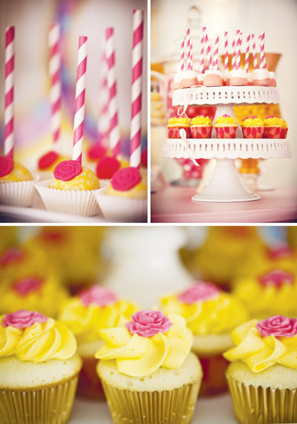 Cupcakes e cakepops em rosa e amarelo, as cores predominantes do grande baile da Bela e a Fera