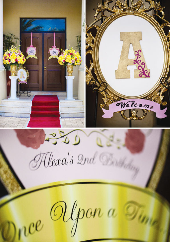 Logo à entrada, o tapete vermelho recebe os convidados. Detalhe para a inicial da aniversariante.
