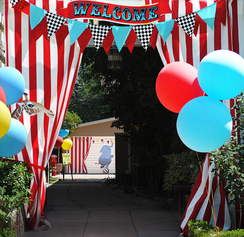 A entrada da festa, como se fosse a entrada de uma tenda de circo. Apenas um pouco de tecido listrado em vermelho e branco nas laterais e você tem o circo na sua festa!