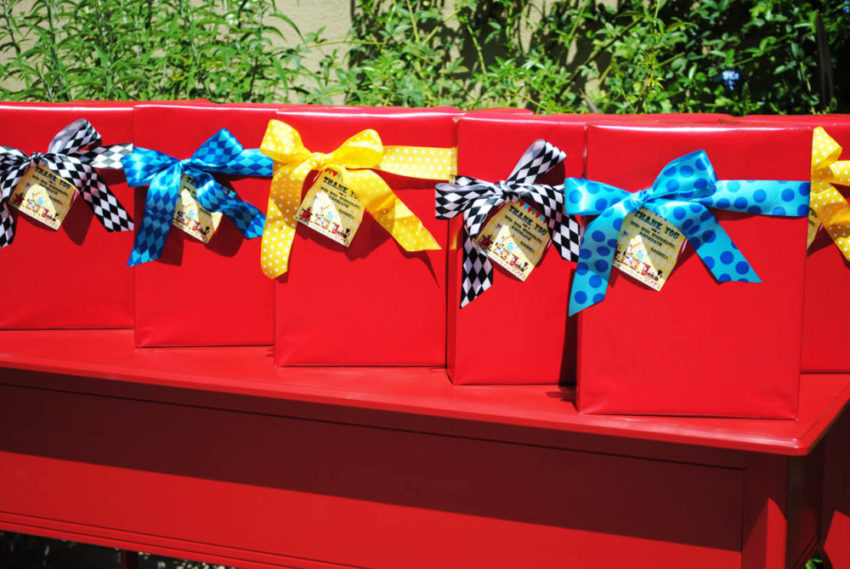 Nos pacotes de lembrancinhas, pequenos trens de madeira para os convidados levarem para casa.