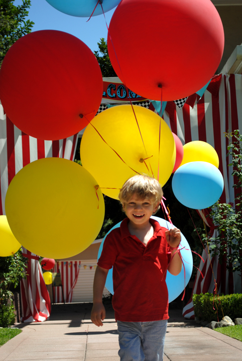 O aniversariante feliz da vida com os balões flutuantes!