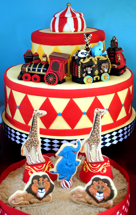 O bolo fazendo referência ao trem do circo, aos animais e à grande tenda.