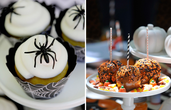 Os cupcakes de aranha e os cake pops com granulado em preto e laranja fizeram bonito na decoração