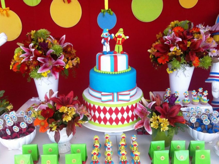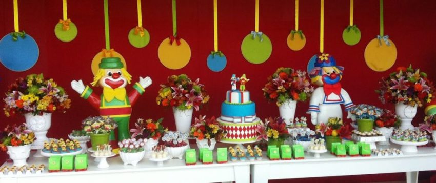 A mesa decorada: harmonia entre doces, bolo, personagens e as bolas coloridas ao fundo.