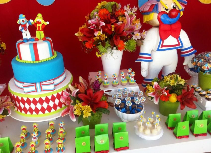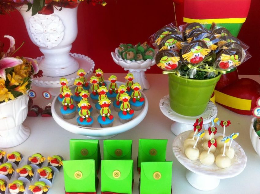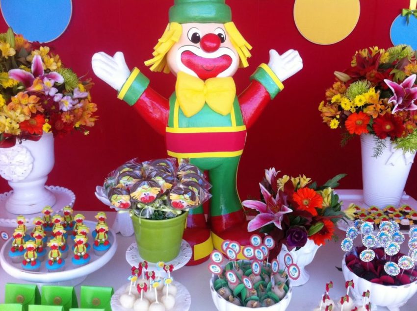 Bandejas e vasos de alturas variadas compõem a mesa. Olha os pirulitos de chocolate com palhacinho, que delícia!