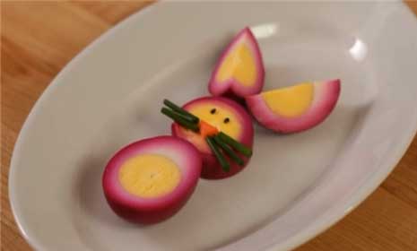 Deixe os ovos já cozidos e descascados dentro de uma jarra ou pote com suco de beterraba coado por dois dias, na geladeira (isso dará o toque rosa ao seu coelho!). Depois desse tempo, tire os ovos e os seque com um papel toalha. Corte o primeiro ovo ao meio, longitudinalmente, para fazer a barriga. Corte a outra metade novamente ao meio, para fazer as orelhas. Corte o segundo ovo transversalmente, em rodelas. Pegue uma das rodelas para fazer a carinha redonda do coelho. Faça os bigodes com cebolinha e o focinho com um pedacinho de cenoura em formato de triângulo. O toque final dos olhinhos fica por conta do gergelim. Uma graça, impossível do filhote resistir!