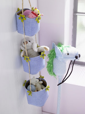 Adorei essa ideia de como guardá-los. Prática e charmosa! Basta pendurar cestos ou baldinhos na parede, enchê-los com os brinquedos e em poucos segundos sua casa vai estar mais arrumada. Veja só: