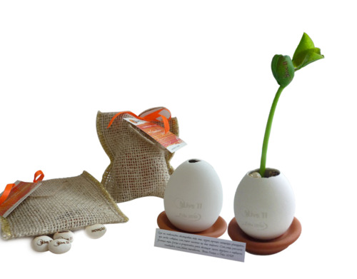 Outra opção oferecida é o Ovo Mágico, um ovinho de cerâmica do tamanho de um ovo normal, que vem em uma bandejinha. Você deve quebrar a parte de cima do ovo, retirar a mensagem da sorte que vem dentro e regá-lo. Em poucos dias você verá germinar uma plantinha, que pode ser um manjericão, pimenta vermelha ou outra a sua escolha. Não fica demais como uma lembrança ecológica de uma festa com tema de fazendinha ou mesmo da Galinha Pintadinha?